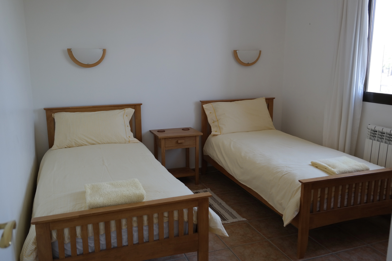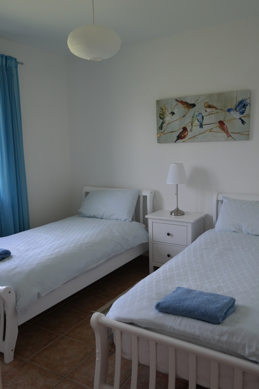 Bedroom 2 (ground floor) TWIN single beds, bedside table, hanging rail.